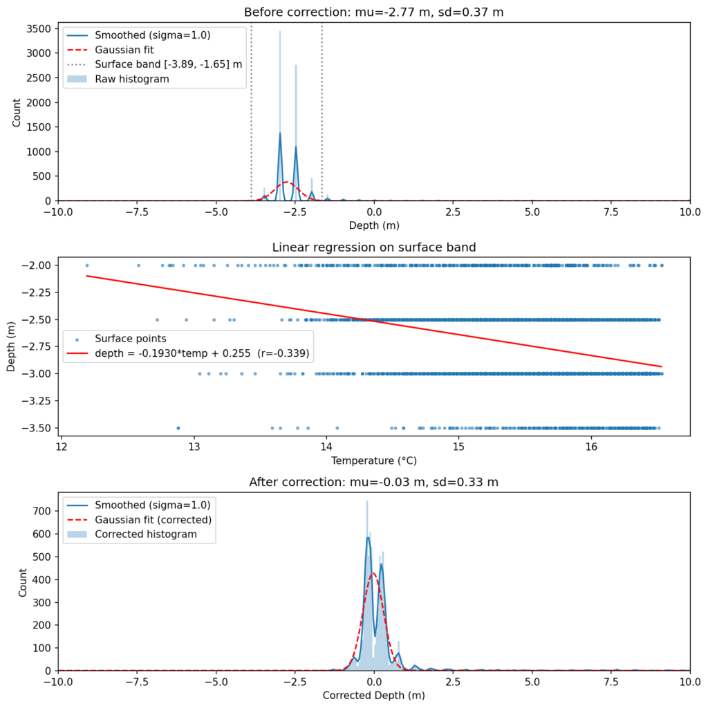 ・水面付近の温度と深度の関係を線形回帰でモデル化し、温度ドリフトを補正します。